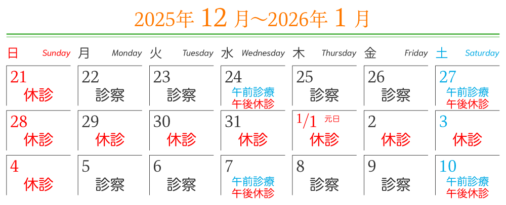 HOME お知らせ 年末年始休診のお知らせ 2025年12月17日 2025年12月28日(日)から2026年1月4日(日)まで年末年始の休診とさせていただきます。1月5日(月)から通常診療いたします。ご不便をおかけいたしますが、よろしくお願いいたします。